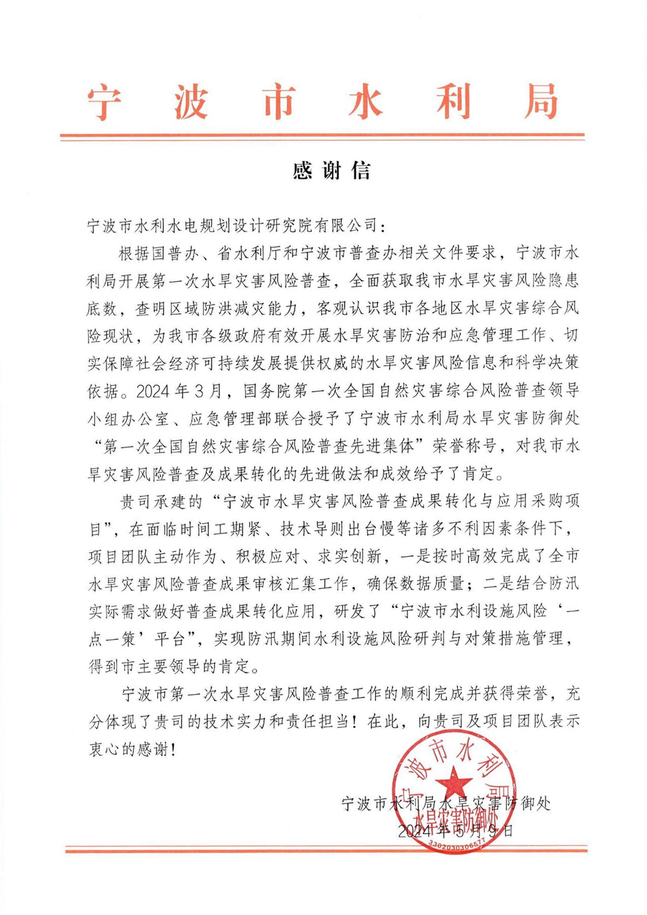 憑借上述三個重大項目中的出色表現(xiàn),我院分別收獲來自寧波市水利局、寧波東方理工大學和龍游縣林業(yè)水利局發(fā)來的感謝信。這不僅是對我院專業(yè)能力和敬業(yè)精神的高度認可,更激勵著我院在未來持續(xù)奮進,為更多項目貢獻力量。