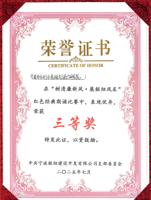 為慶祝中國共產(chǎn)黨成立104周年,2025年7月1日,寧波樞紐建設(shè)開發(fā)有限公司隆重舉行了“紅動樞紐·同心共建”迎“七一”主題黨建活動。作為寧波樞紐片區(qū)重要參建單位和黨建聯(lián)盟成員,我院黨總支書記、副院長王洪霞帶隊參與了本次活動,并且,我院兩位青年職工攜選送作品在“樹清廉新風(fēng)·展樞紐風(fēng)采”樞紐片區(qū)紅色經(jīng)典朗誦比賽中榮獲三等獎。