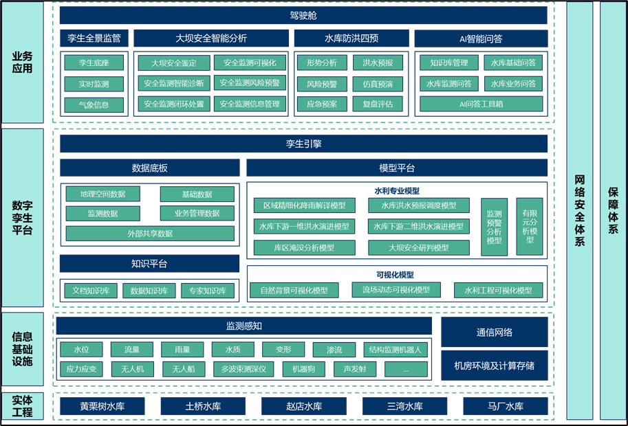 《方案》以黃栗樹等五座水庫(kù)為核心對(duì)象,進(jìn)行了前瞻性的信息化總體設(shè)計(jì)。旨在通過引入先進(jìn)信息技術(shù),構(gòu)建覆蓋水庫(kù)運(yùn)行管理全生命周期的智能化體系。該體系以實(shí)現(xiàn)對(duì)水雨情、工情、供用水、水質(zhì)及安全狀況等關(guān)鍵要素的精準(zhǔn)感知、動(dòng)態(tài)監(jiān)測(cè)、智能分析與高效決策為核心目標(biāo),全面提升水庫(kù)在科學(xué)調(diào)度、風(fēng)險(xiǎn)防控、管理效能與服務(wù)保障方面的綜合能力。主要建設(shè)內(nèi)容涵蓋智慧業(yè)務(wù)應(yīng)用、數(shù)字孿生平臺(tái)、信息基礎(chǔ)設(shè)施及網(wǎng)絡(luò)安全體系,共同構(gòu)成層次清晰、協(xié)同聯(lián)動(dòng)、安全可靠的現(xiàn)代化水利信息化總體框架,為區(qū)域水安全與可持續(xù)發(fā)展奠定堅(jiān)實(shí)的數(shù)字基石。
