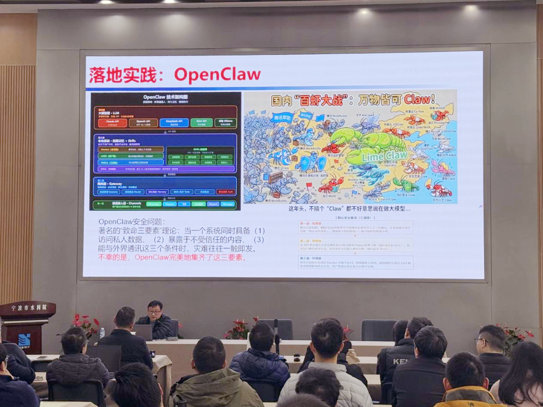 本次專題培訓圍繞AI智能體的概念展開,簡要分析其與大模型的區(qū)別,系統(tǒng)闡述了智能體的發(fā)展歷程、構成要素及落地實施路徑,并現(xiàn)場演示了“數(shù)智水院智能體”及當下流行的OpenClaw等應用實踐案例。演示環(huán)節(jié)生動直觀,引發(fā)參訓干部的濃厚興趣。大家紛紛表示深受啟發(fā),對AI賦能勘察設計工作有了更清晰的認知和更強的信心。