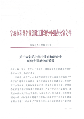 我院榮獲寧波市第七批“和諧企業(yè)創(chuàng)建先進(jìn)單位”榮譽稱號