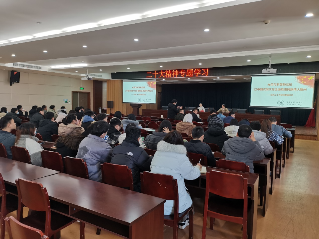 2023年1月31日下午,為深入學(xué)習(xí)貫徹黨的二十大精神,院黨總支組織黨員學(xué)習(xí)活動(dòng),特邀寧波大學(xué)法學(xué)院羅維教授來(lái)院里開展輔導(dǎo)講座,羅維教授以“光榮與夢(mèng)想的遠(yuǎn)征:以中國(guó)式現(xiàn)代化全面推進(jìn)民族偉大復(fù)興——二十大精神專題學(xué)習(xí)”為題,為全體黨員同志們開設(shè)了一場(chǎng)引人入勝的講座。