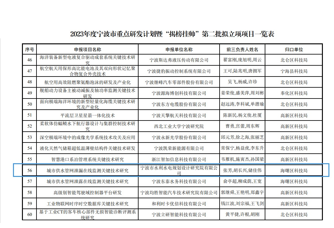 此前,我院“城市供水管網(wǎng)泄漏在線監(jiān)測關(guān)鍵技術(shù)研究”已入選寧波市重點(diǎn)研發(fā)計(jì)劃暨“揭榜掛帥”第二批擬立項(xiàng)項(xiàng)目。兩個(gè)項(xiàng)目合同總經(jīng)費(fèi)達(dá)4000萬元。
