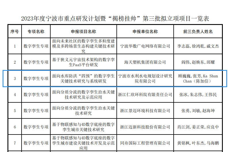 近日,2023年度寧波市重點(diǎn)研發(fā)計(jì)劃暨“揭榜掛帥”第三批擬立項(xiàng)項(xiàng)目公示,我院“面向水庫防洪‘四預(yù)’的數(shù)字孿生關(guān)鍵技術(shù)研究與系統(tǒng)研發(fā)”項(xiàng)目成功上榜。
